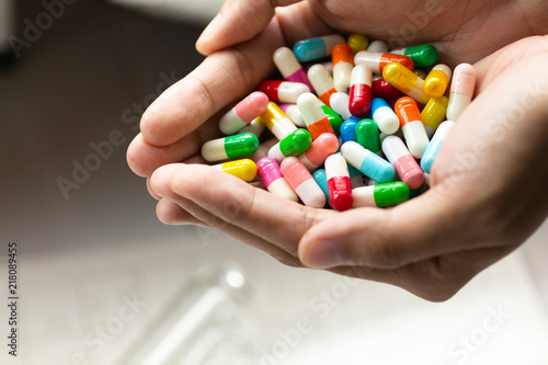 Colorful capsules tablets hold on hand. Image use for health care concept