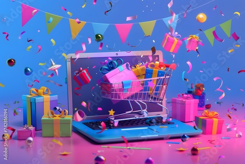 Colorful cart brimming with festive gifts and boxes,on laptop perfect for holiday, birthdays, and any celebration