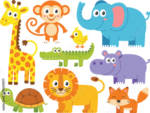 Colorful cartoon animals including giraffe monkey elephant crocodile chick turtle lion hippo fox