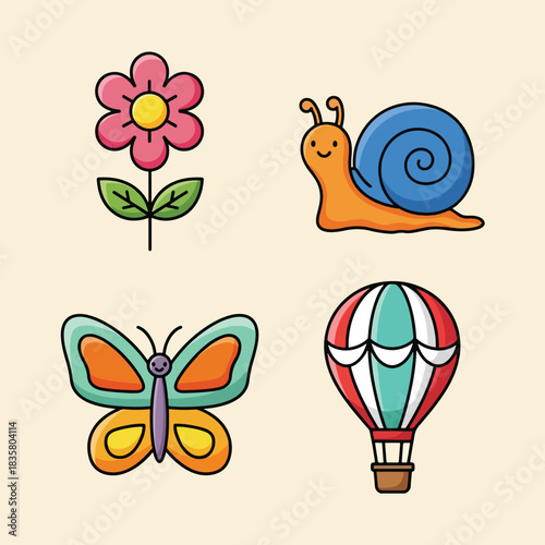 Colorful cartoon flower snail butterfly hot air balloon illustrations.