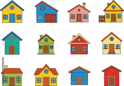 Colorful cartoon houses, cute village homes, playful house icons, vector illustration, flat design, children's house, home collection, bright colors, simple architecture, kids' drawings, residential b