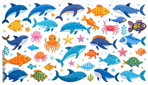 Colorful Cartoon Ocean Animals Dolphins Fish Octopus and Starfish Illustration