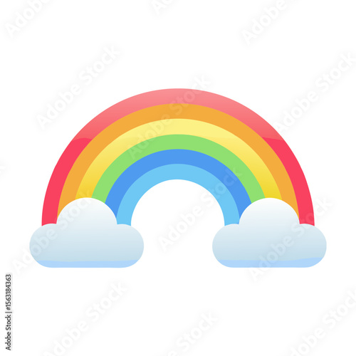 Colorful cartoon rainbow with fluffy clouds isolated on white background, cute vector illustration, cheerful weather icon