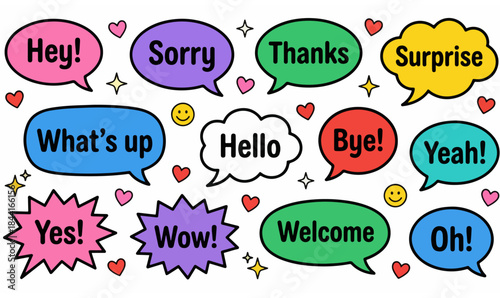 Colorful Cartoon Speech Bubbles with Playful Decorative Elements, colorful, speech bubbles, phrases, cartoon, playful, vibrant, whimsical, white background, thick outlines, jagged bubbles, rounded png