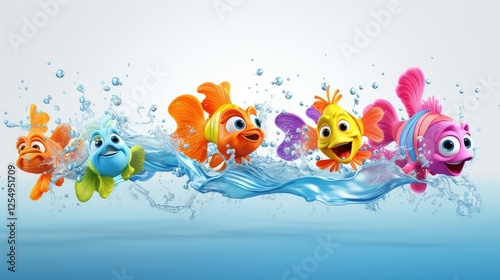 colourful, cartoon, water, splash, illustration, fish, leaping, movement, life, joy, freedom, vibrant, dynamic, playful, aquatic, animation, whimsical, lively, energetic, fun, creative, artistic, imaginative, expressive, cheerful, bright, high-coloured, fluid, motion, fantasy