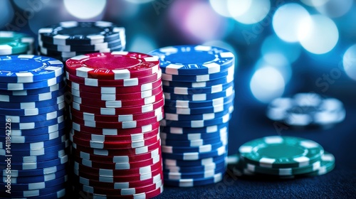 casino, chips, gambling, poker, game, colourful, red, blue, green, stack, table, nightlife, entertainment, risk, luck, strategy, bet, wager, dealer, card, player, tournament, night, thrill, fun, exciting, competition, activity, neon, shiny, concept, succeed, victory, loss, chance, dice, casino game, party
