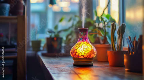 decor, wood, ambience, living, ceramic, pot, light, nature, desk, decoration, fresh, flora, houseplant, scented, greenery, table, indoor, bright, wellness, serene, glasses, relaxation, calm, cosy, steam, calmness, arrangement, soothing, warm, aromatherapy, glow, colourful, diffuser, art, vase, interior, lamp, plant, home, vibrant, morning, essential, oil, peaceful, natural