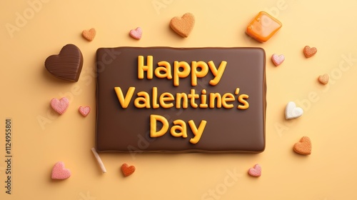 Colorful Chocolate Bar with a Happy Valentine's Day Message Surrounded by Heart-Shaped Candies and Cookies on a Warm Tone Background