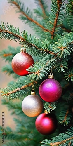 Colorful Christmas decorations adorn the branches of a spruce tree, vibrant balls in shades of red, golden, silver and pink, embodying holiday cheer in winter. Happy New Year art background. AI