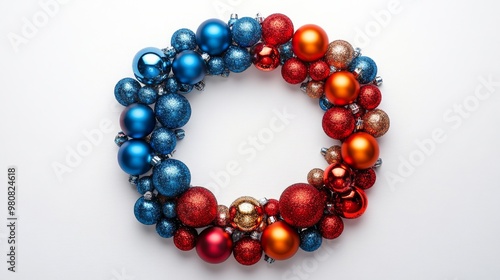 Colorful Christmas wreath adorned with vibrant ornaments in red, blue, and gold tones