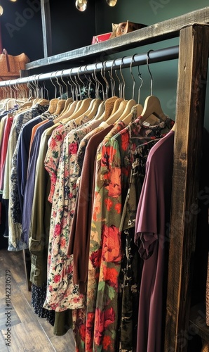 clothes rack, closet, clothes, hanger, wood, rack, retail, boutique, fashion, clothing, store, shop, display, garment, style, apparel, vintage, fabric, silk, floral, pattern, texture, design, organised, interior, rustic, brown, grey, black, purple