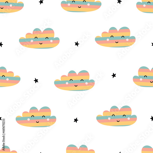 Colorful clouds on white background seamless pattern background. Cartoon style hand drawn design for baby clothes pattern, blanket. or print wallpaper vector illustration