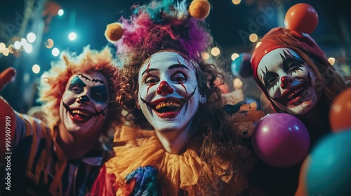Colorful clowns, jesters, and fairytale characters at a Halloween party, smiling brightly but with a dark, eerie undertone in their expressions.