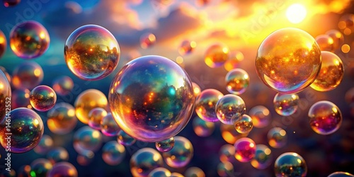 Colorful cluster of bubbles suspended in mid-air, radiating a warm glow, with individual orbs floating gently towards each other , ethereal sphere group, bubbles