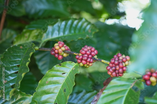 Colorful coffee cherries ripen along slender branches amid green leaves, showing natural growth stages and the beauty of coffee plants in a lush environment