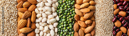 grain, nut, seed, legume, healthy, food, almond, green peas, sesame, protein, dietary, nourishment, organic, natural, vegetarian, snack, wholesome, fiber, vitamin, mineral, culinary, harvest, agriculture, raw, assorted, variety, texture, background, healthy eating, energy, sustainable, environmentally friendly, colourful, fresh, epicure, cooking