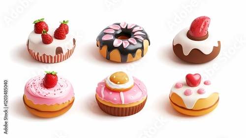 dessert, sweet, cake, donut, chocolate, strawberry, cream, frosting, decoration, bakery, treat, epicure, colourful, festive, sugary, sliced, topping, glaze, confectionery, pastry, snack, cheerful, fun, party, presentation, food, delightful, indulgent, design, round, illustration, art, humor, beauty, imaginative, playful, appealing, texture, delicious, simple, unique, vibrant, hand-made, showcase, creativity