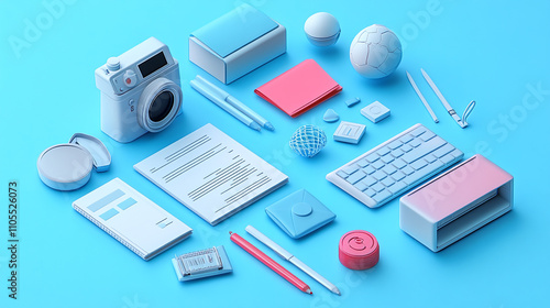 stationery, office supply, colourful, arrangement, notebook, camera, pen, blue background, school supplies, organisation, minimalism, design, writing, paper, technology, creativity, workspace, modern, ball-shaped, plastic, flat, casual attire, vibrant, education, aesthetic, art supply, vignetting, pen, marker, layout, composition