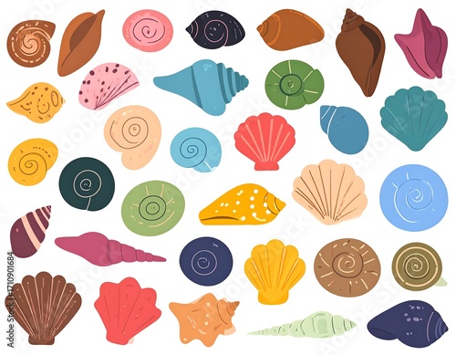 shell, seashell, colourful, collection, various, spiral, ocean, marin, sea, beach, coastal, pattern, ocean life, nature, illustration, vector, design, art, graphic, cute, flat, decorative, isolated, different, unique, bright, vibrant