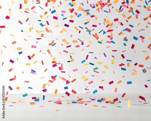 Colorful confetti falling and scattering across a white background with a light gray floor celebration