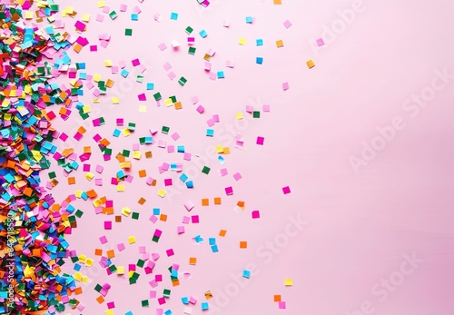 Colorful confetti falling on pink background with heart-shaped decorations. Romantic Valentine celebration with vibrant atmosphere. Perfect for love-related events, and cheerful holiday greetings
