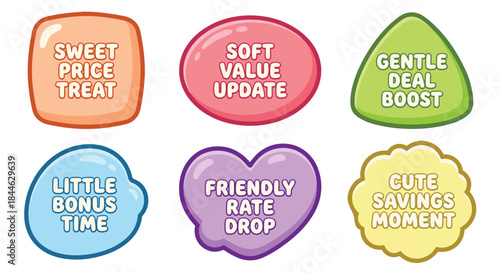 Colorful conversation hearts with promotional messages and playful designs are displayed