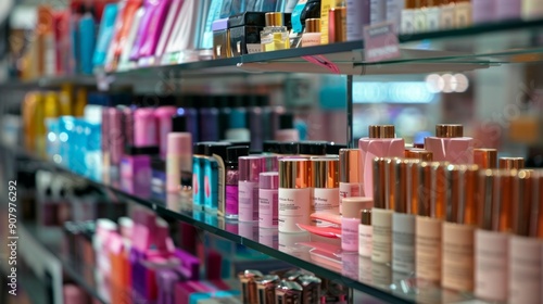 cosmetic, beauty product, beauty, make-up, skincare, shelf, retail, store, shop, display, product, brand, cardboard box, bottle, jar, tube, colourful, vibrant, pink, blue, purple, gold, glasses, commercial, shopping, market, department store, beauty parlour