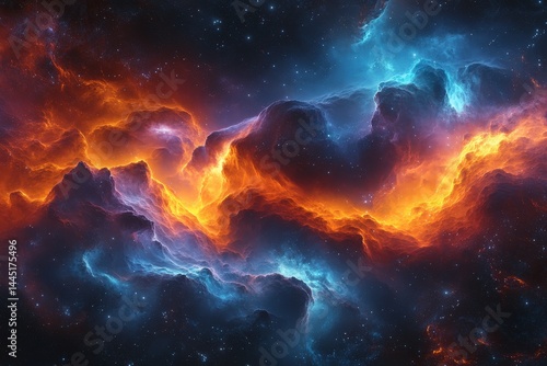 Colorful cosmic clouds in deep space exhibit vibrant shades of blue, orange, and purple illuminating the universe