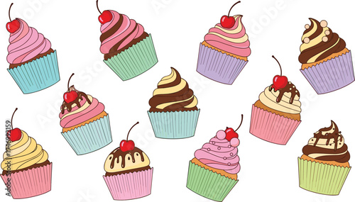 Colorful cupcake vector illustration set with cherry topping and chocolate frosting, sweet bakery dessert collection for party, birthday and cafe menu design