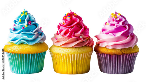 Colorful cupcakes on a transparent background with icing and sprinkles, perfect for a festive celebration. These homemade sweet treats are a delightful addition to any dessert table