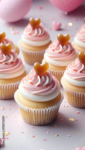 Colorful cupcakes with pink frosting and golden heart toppers, crafted for celebrations, events, or festive treats, symbolizing love and joy with their vibrant and tasty presentation.