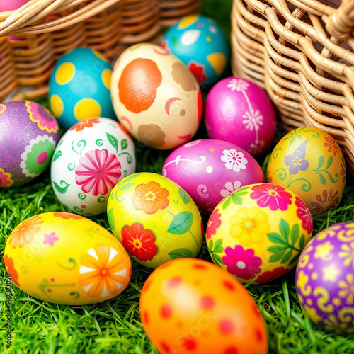 Colorful decorated eggs arranged on green grass near a wicker basket with fairy lights during a festive spring celebration