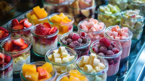 Colorful desserts in jars displayed in confectionery shop window