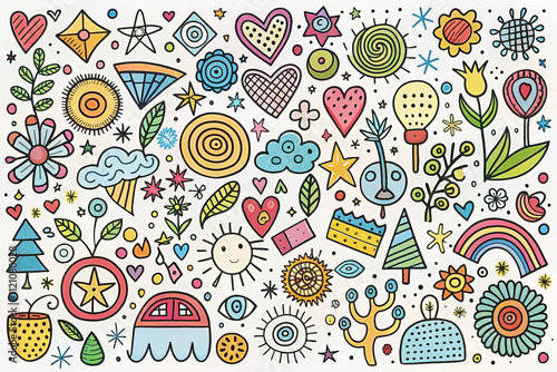 Colorful doodle collection with various shapes, flowers, hearts, and abstract elements.