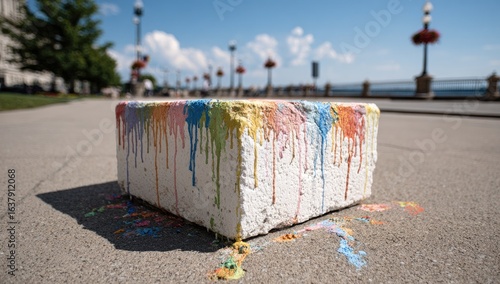 block, paint, colourful, dripping, art, concrete, city, park, paseo, rainbow, design, urban, street, public, installation, creative, vibrant, many-coloured, spilled, messy, drip, texture, white, pastel, liquid, bold, happy, summer, daylight, sun, sky, cloud, horizon, water, lake, building, flower, lamp, pedestrian, people, detail, closeup, photo, contemporary, modern
