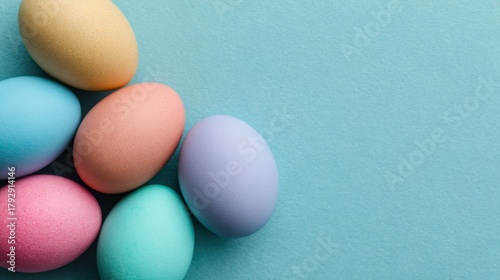 Colorful easter egg decoration festive celebration image pastel blue background top view spring concept