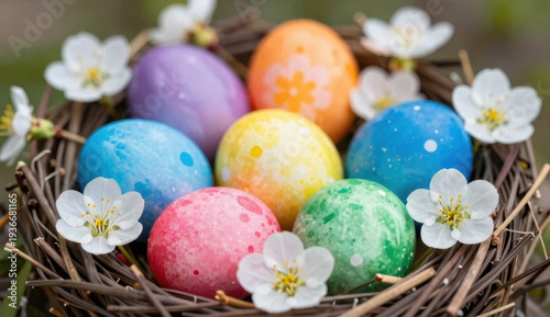 Colorful Easter eggs in a basket and nest for spring holiday celebration
