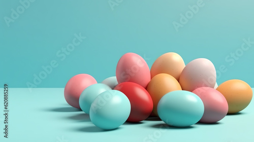 Colorful Easter eggs on pastel blue background. Creative design. 3d rendering, design concept, copy space, free space for text, AI Generated.