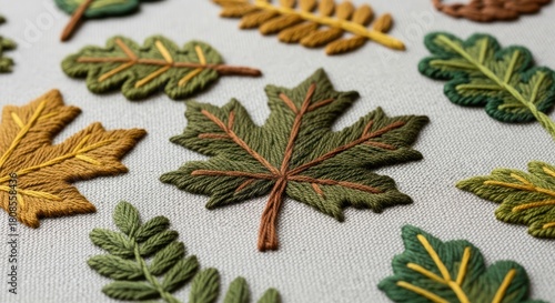 Colorful embroidered leaves on fabric background: nature-inspired textile art