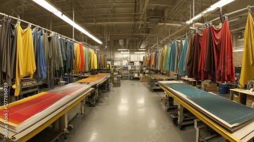fabric, swatch, textile, factory, colours, hanging, industry, manufacturing, production, material, clothes, sample, industrial, table, workspace, indoor, interior, nobody, metal, rack, ceiling, light, fluorescent, warehouse, design, dye, cotton, linen, silk, nylon, polyester, pattern, shades, tint, hue, high-coloured, spectrum, chromatic, colourful, palette, arrangement, organisation, distribution, placement, linear, perspective, processing
