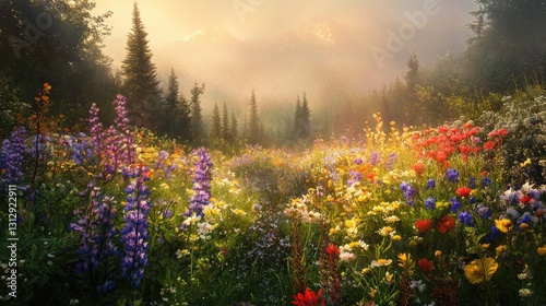 Colorful Field of Wildflowers Under Misty Morning Light with Majestic Mountains in Background