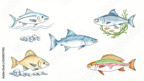 Colorful Fish Illustration Salmon Tuna More Aquatic Life