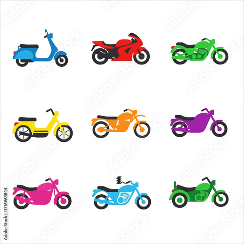 motorcycle, bike, scooter, simple, colourful, transportation, vehicle, set, collection, vector, illustration, graphic, design element, isolated, white background, transport, travel, speed, motor, chopper, cruiser, moped, dirt bike, touring, urban, city, delivery, racing, journey, symbol, emblem, minimalist, digital artwork, technology, quick, compact