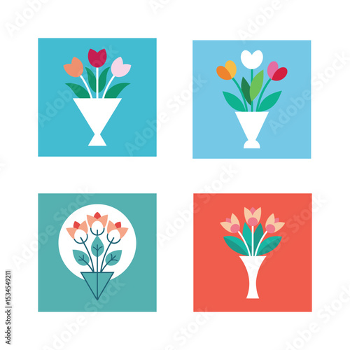 Colorful flat vector illustrations of tulip bouquets in white vases for various design projects