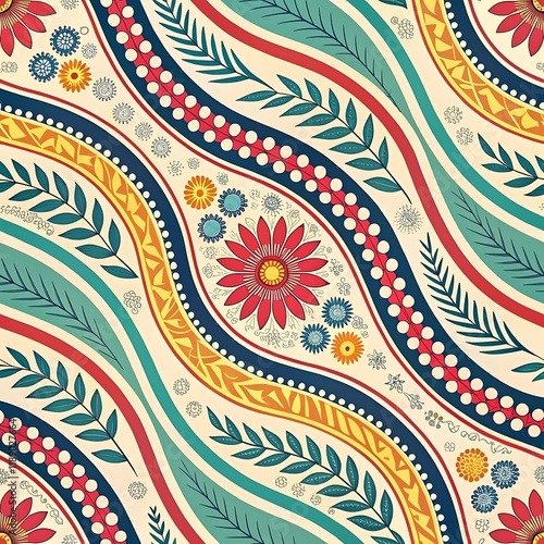 Colorful floral and leaf abstract pattern, Seamless pattern featuring vibrant flowers, leaves, and wavy geometric lines in bold red, yellow, and teal tones on a cream background.