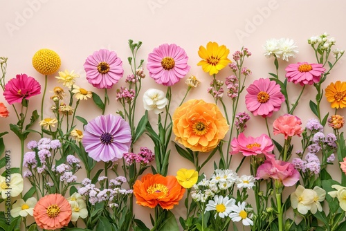 flower, blossom, pink, yellow, orange, white, green, stem, leaf, arrangement, floral, plant, bloom, nature, botanical, vibrant, bright, colours, light, background, flat, lay, top, view, summer, spring, garden, fresh, natural, growth, beauty, delicate, soft, pastel, elegant, simple, decorative, artistic, pattern, texture, design, closeup, macro, detail, studio, isolated, nobody