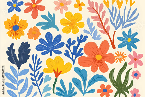Colorful Floral Illustration Shows Various Flowers and Leaves in Vibrant Hues with Decorative Elements