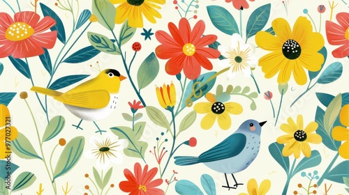 Colorful floral pattern with birds, featuring vibrant yellow and red flowers alongside blue and yellow birds on a soft cream background Bright and cheerful design