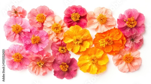Colorful flowers arranged on white background. Flat lay design. Possible use in floral design