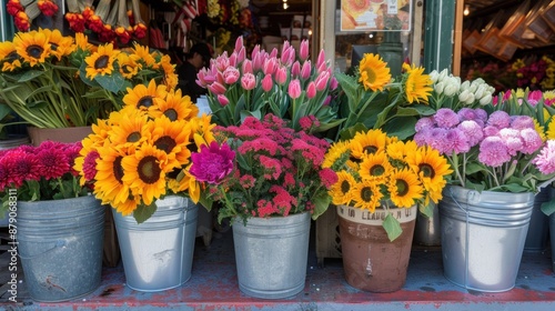 Colorful Flowers in Buckets